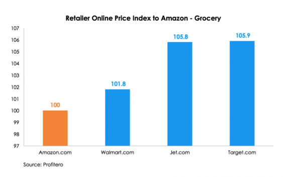 Amazon remains the online price leader, but Walmart is definitely nipping at its heels, according to Profitero’s latest pricing study, Price Wars: Grocery, Household & Beauty. Only a slim 2 percent separates the retailers’ online pricing on grocery products studied during a recent three-month period. In contrast, Jet.com and Target trail Amazon by about 6 percent.