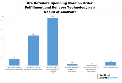 With these demands for fast and free shipping, retailers have been forced to invest in their operations and fulfillment teams to ensure they can keep pace. Part of keeping pace means having software systems that are optimizing efficiencies throughout the supply chain. The chart below analyzes how retailers’ spending on order fulfillment and delivery technology has changed as a result of Amazon's lead position in this area.