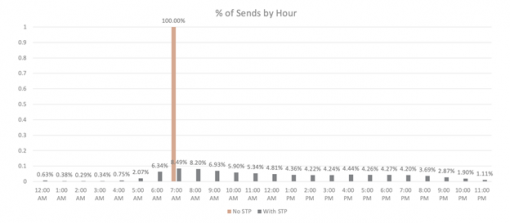 The following chart shows the distribution of sends for a customer before and after they started using STP. Previously, it sent all their emails at 7 a.m. After implementing STP, their emails were more evenly distributed, resulting in a 3.7 percent lift in revenue per email.