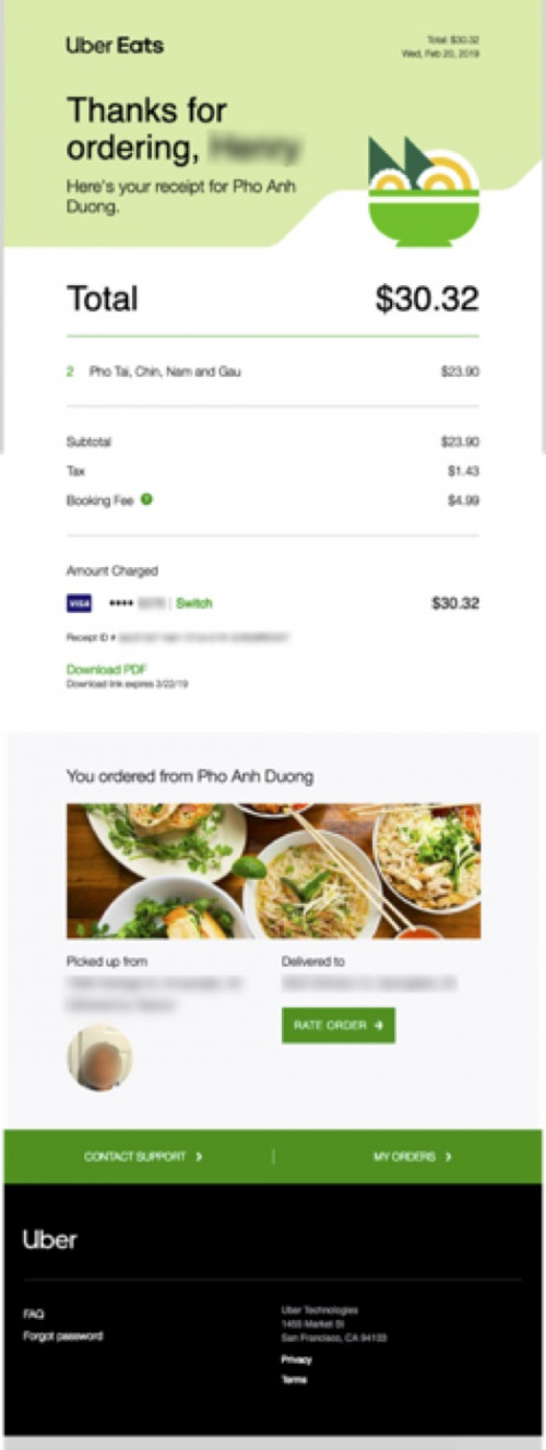 UberEats sends only one email to confirm a transaction. Typical receipt elements are included above the fold, with a call-to-action button asking customers to rate the order.