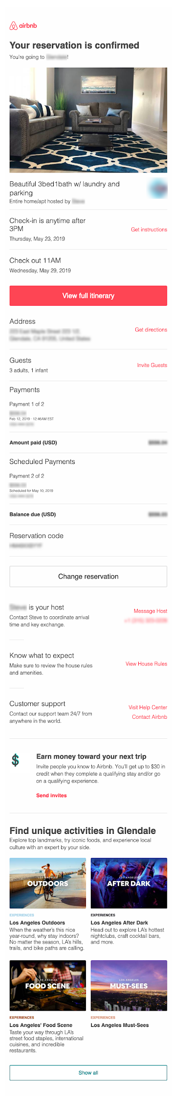 Airbnb sends a purchase receipt as an independent campaign, but also sends a confirmation email within a few minutes after the transaction is completed. The confirmation message, “Reservation confirmed for [location]” has at least 50 percent of the email covering important reservation details needed by the customer (e.g., address, rules, check-in times, etc.). The rest of the content mentions relevant activities at the location of the booking. These suggestions help drive traffic back to the site and offer upsell opportunities.