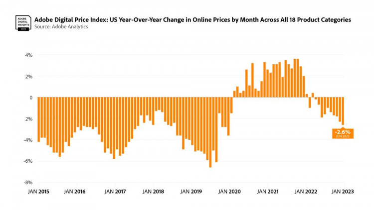Total Retail's Take: While the majority of retail categories are showing a reprieve for consumers from inflationary prices, certain categories are still being hit hard. Pet product prices have skyrocketed 8.1 percent since June 2022, according to Adobe's report. Not far behind that is grocery, which increased 7.5 percent YoY. Higher prices is likely one factor that's leading to consumers continuing to spend conservatively. As a result, retailers may need to offer additional promotions to incentivize purchases, further driving down pricing averages. Annual inflation peaked in June 2022 at 9.1 percent and has been falling ever since, according to the Consumer Price Index. Lowering prices across multiple categories are a welcome change for shoppers, which could benefit retailers and brands in these markets.