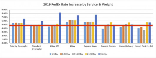FedEx Express and FedEx Ground, subsidiaries of FedEx Corp., will increase shipping rates effective Jan. 7, 2019 by an average of 4.9 percent, while FedEx Freight will increase by an average of 5.9 percent. The change will impact the following: