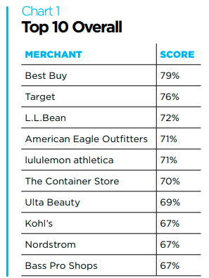 Best Buy was followed by Target, which earned a score of 76 percent. Target’s strong safety measures, consistent messaging, and promotion of technology to assist shoppers helped it obtain a top ranking. L.L.Bean finished in third place, earning 72 percent of the total possible points. It effectively used signage both to inform shoppers as well as move them throughout the store to checkout. Here's the ranking of the top 10: