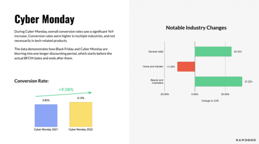 Also worth considering: Buying preferences often change during the sales holiday periods. You might want to consider prioritizing discounts on categories that showed growth compared to 2021, which include pets and animals, beauty and cosmetics, and general retail.