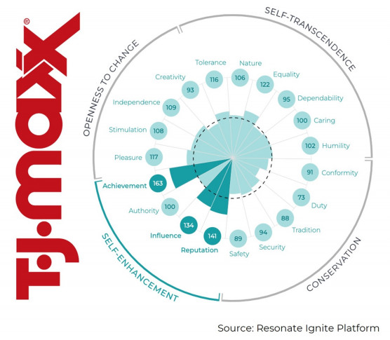 According to the analysis, T.J. Maxx customers value achievement, reputation and influence. When connecting with T.J. Maxx shoppers, marketers should focus their creative and messaging on confidence and success.