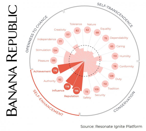 Another set of shoppers who might share similar values is people who shop at J.Crew and Banana Republic. Again, these stores offer similar apparel in style, quality, and price. However, a deeper analysis using Resonate's personal values report illustrates just how different they are.