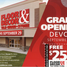 A direct mail piece from flooring retailer Floor & Décor uses a variety of tactics for its grand opening promotion.